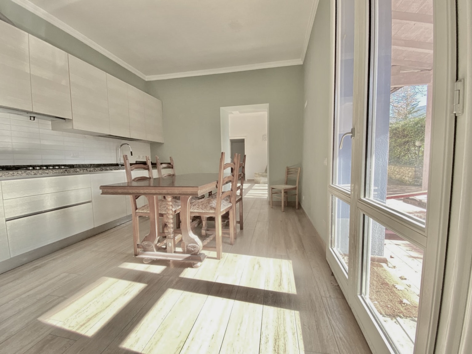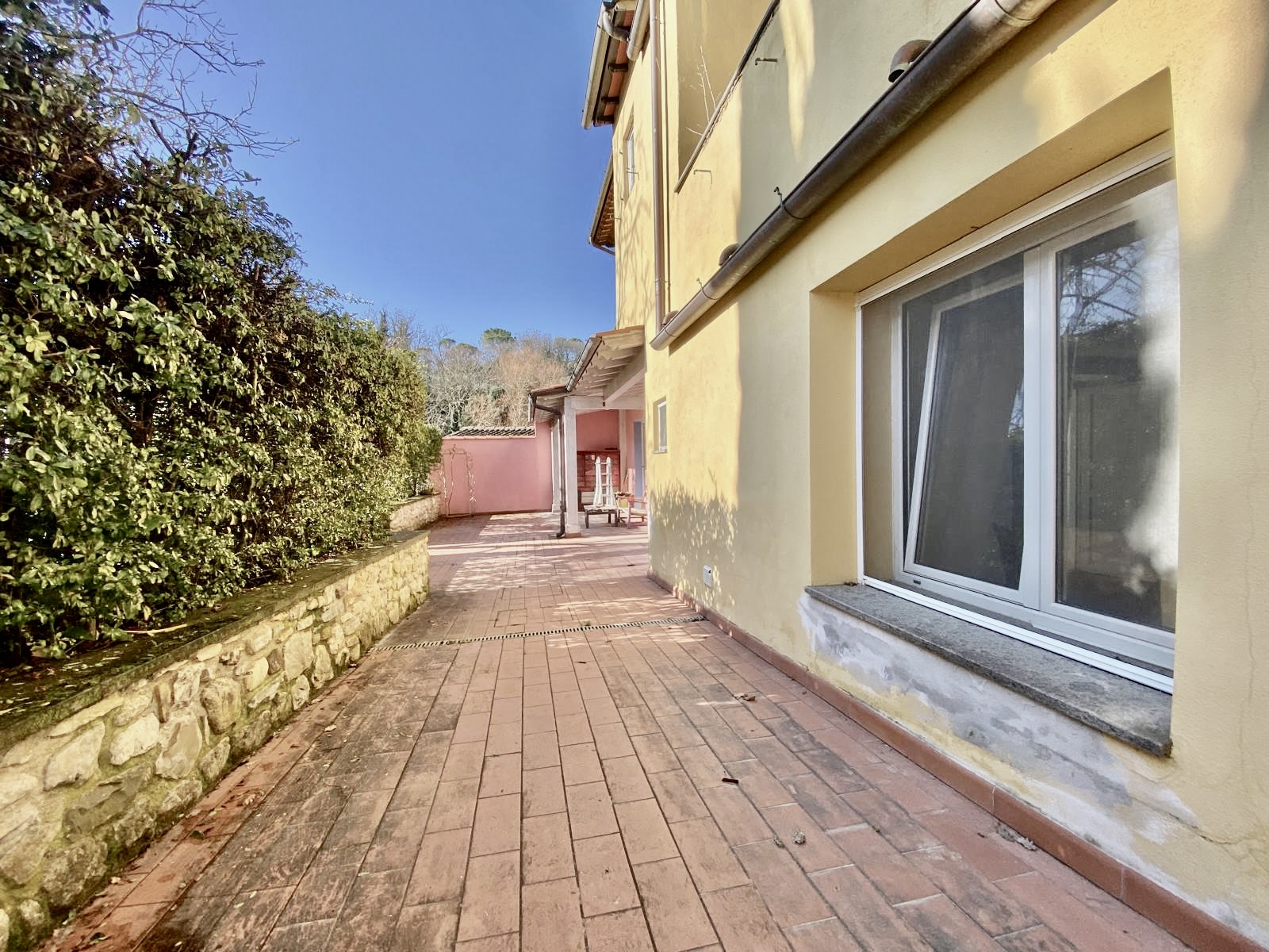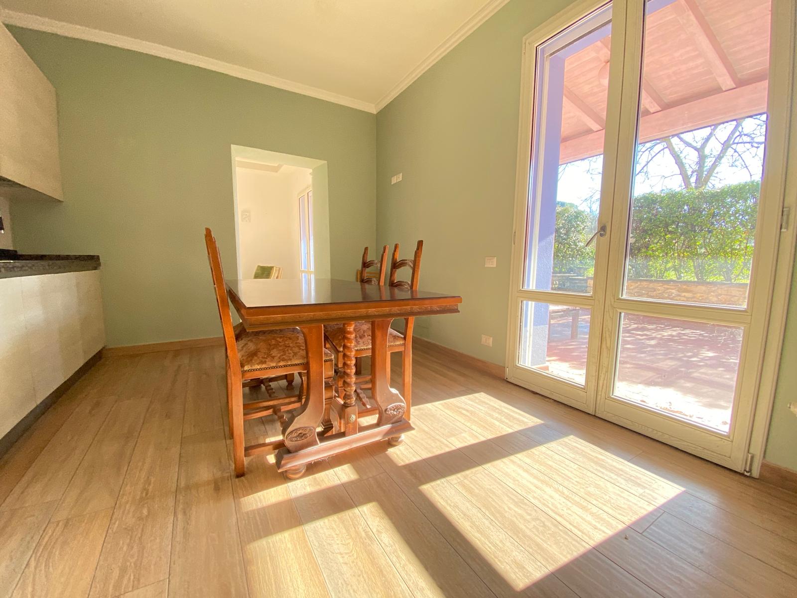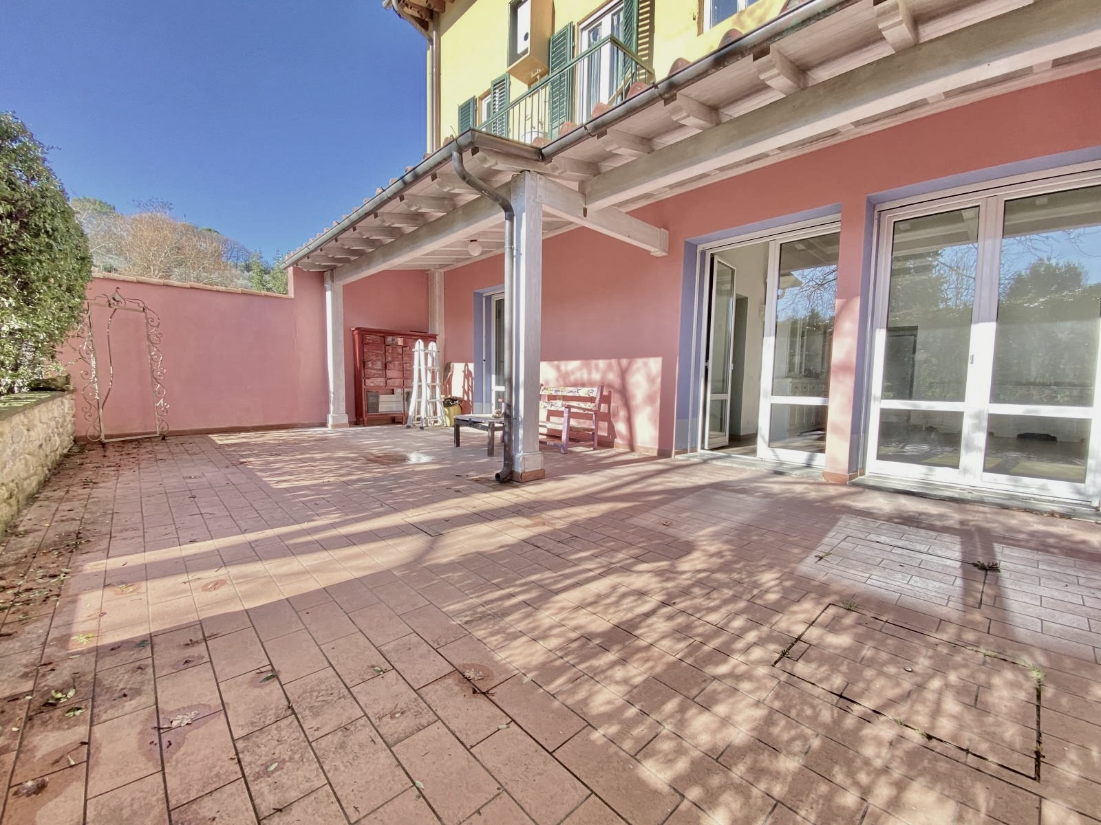 Dalla cucina e dal soggiorno si accede a una resede pavimentata di oltre 50 mq, in parte coperta da tettoia, perfetta per pranzi all’aperto, cene con amici o momenti di relax.
