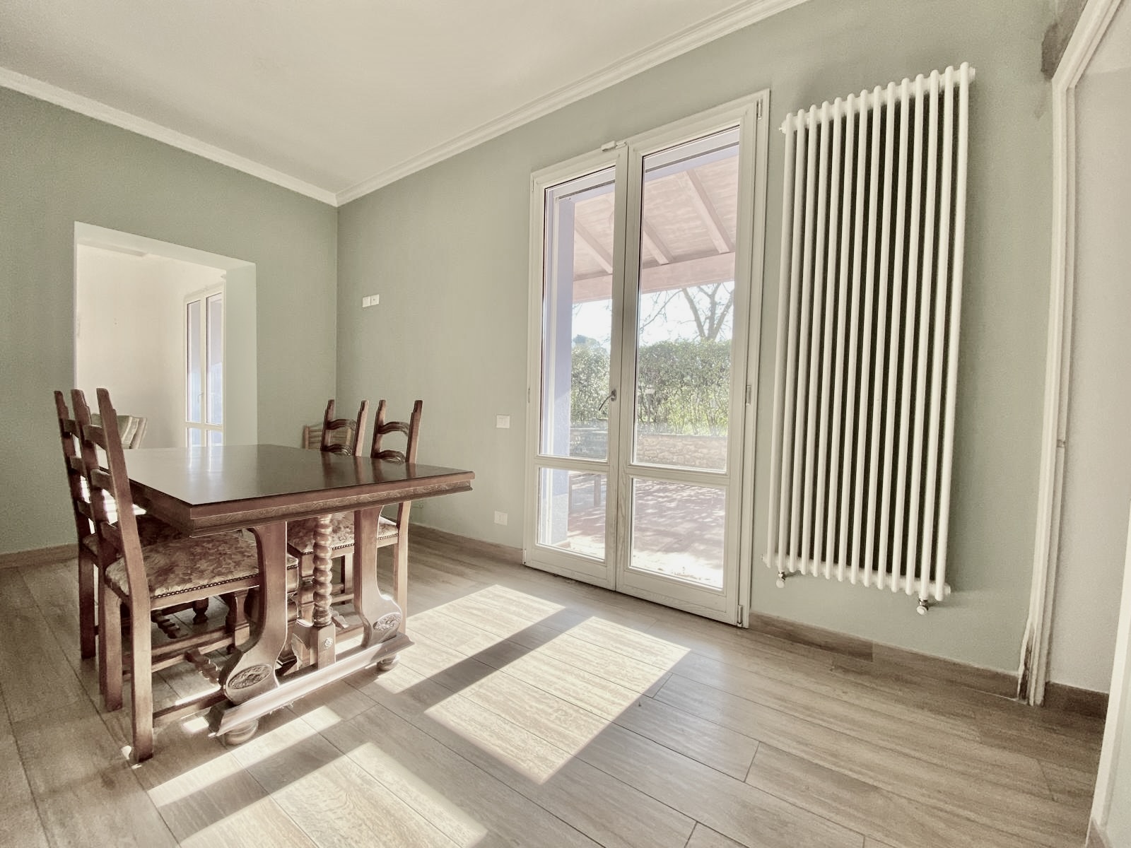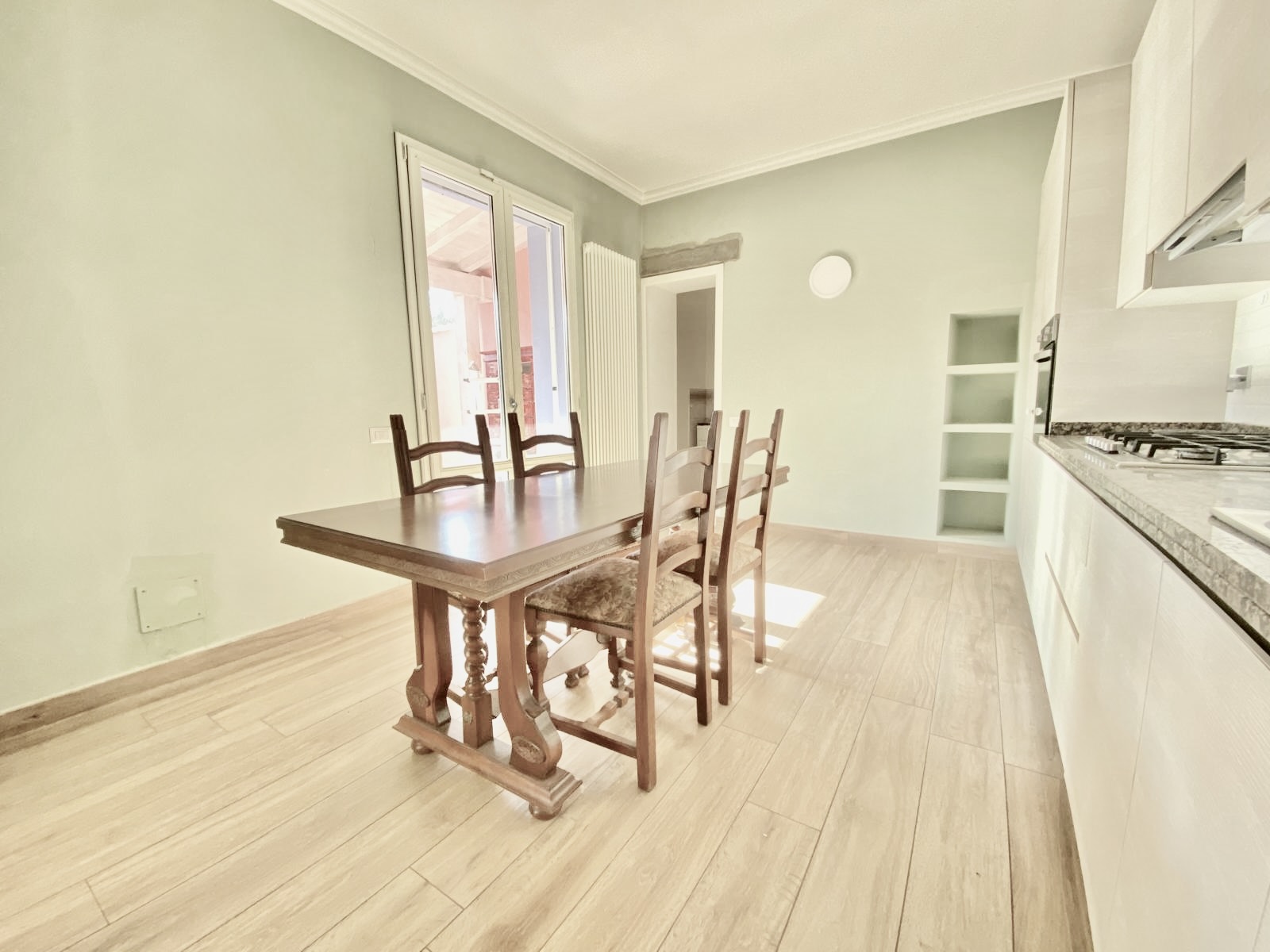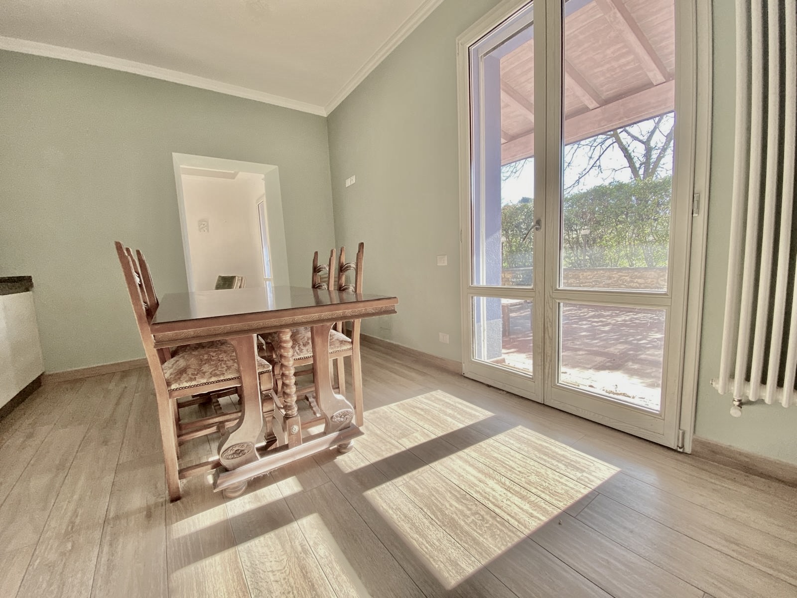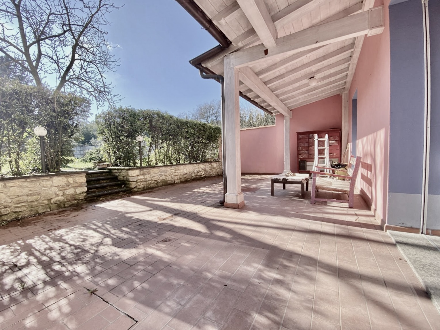 Dalla cucina e dal soggiorno si accede a una resede pavimentata di oltre 50 mq, in parte coperta da tettoia, perfetta per pranzi all’aperto, cene con amici o momenti di relax.