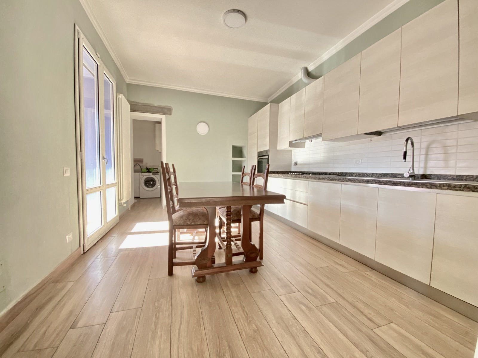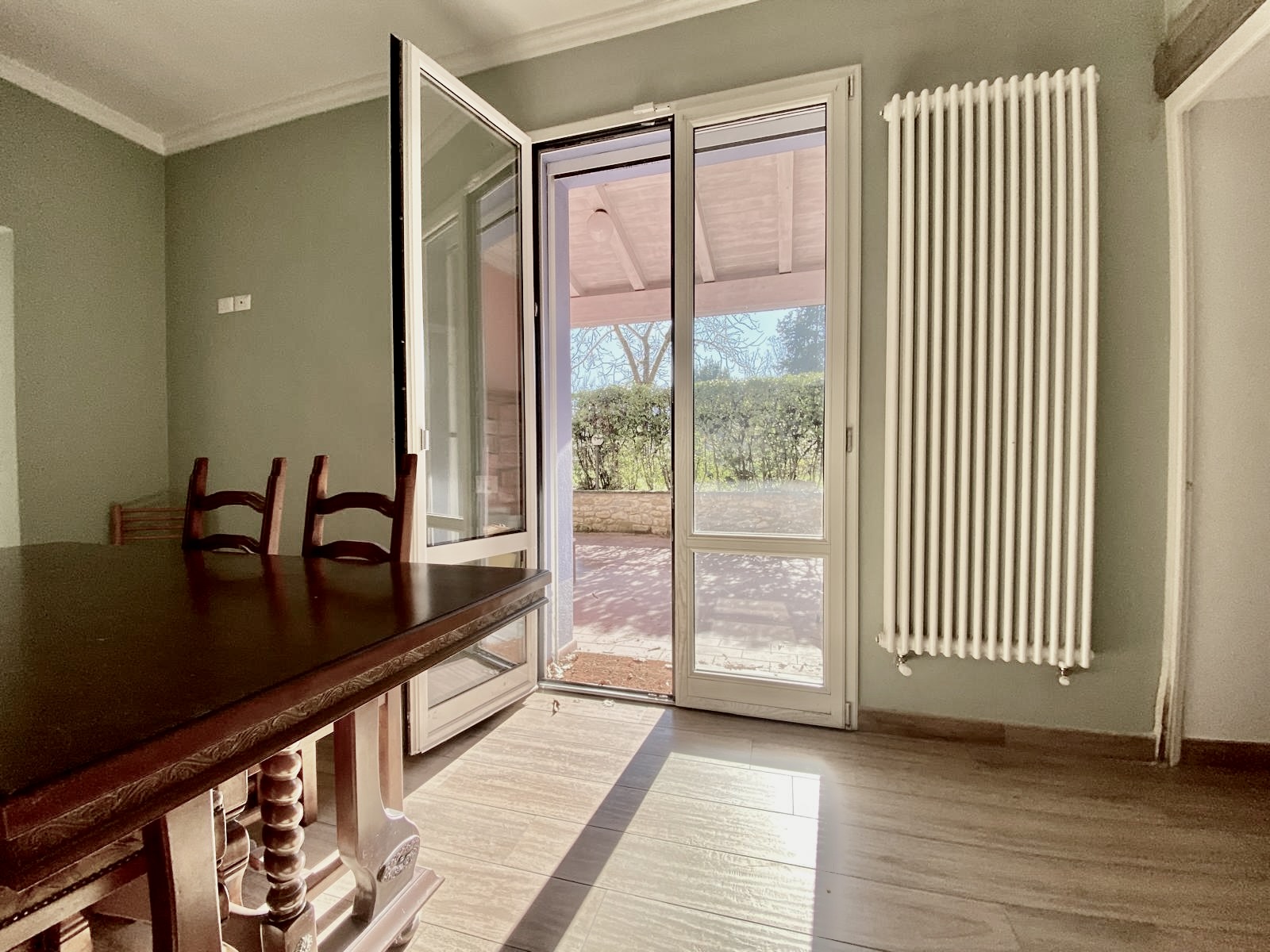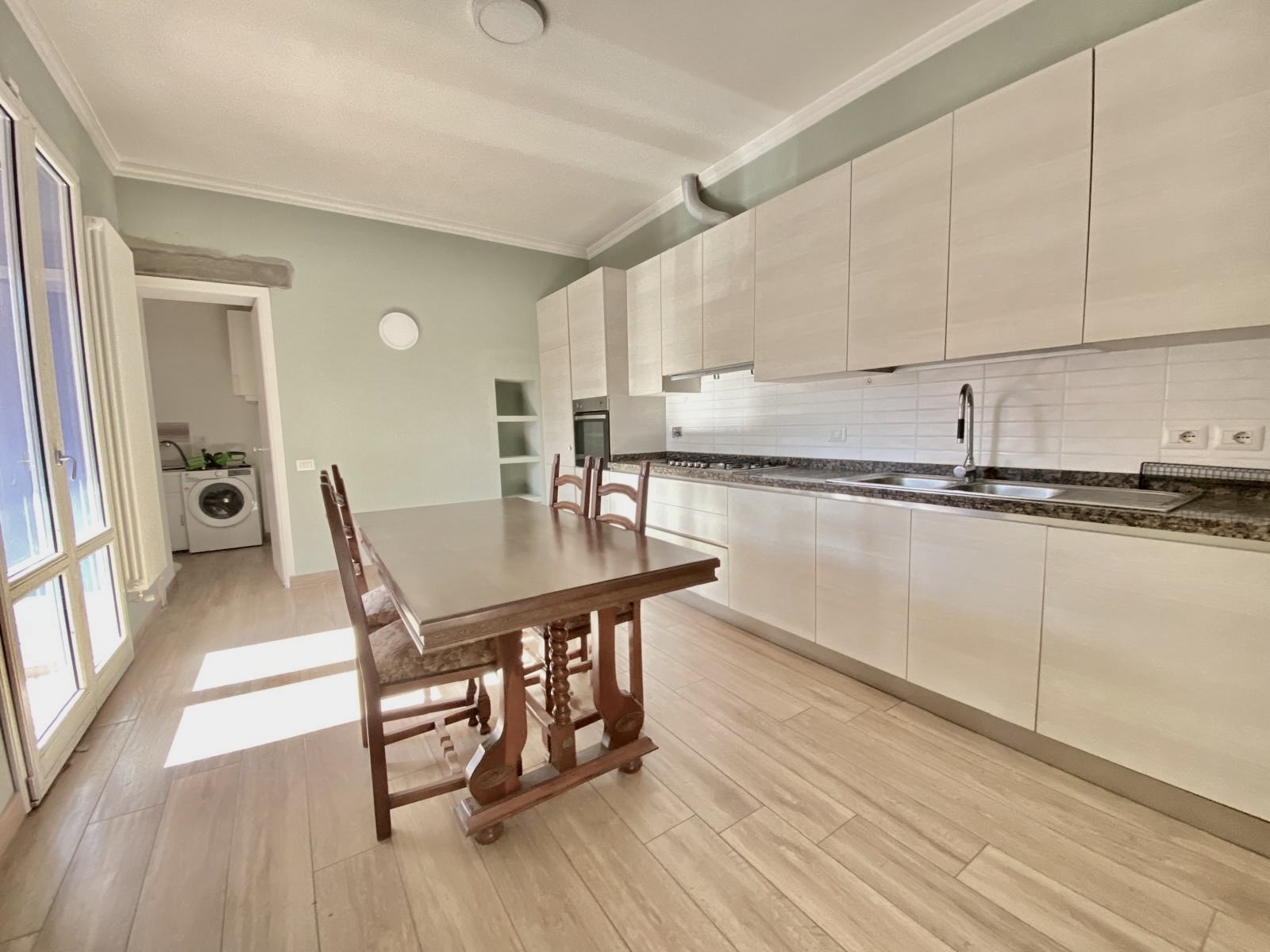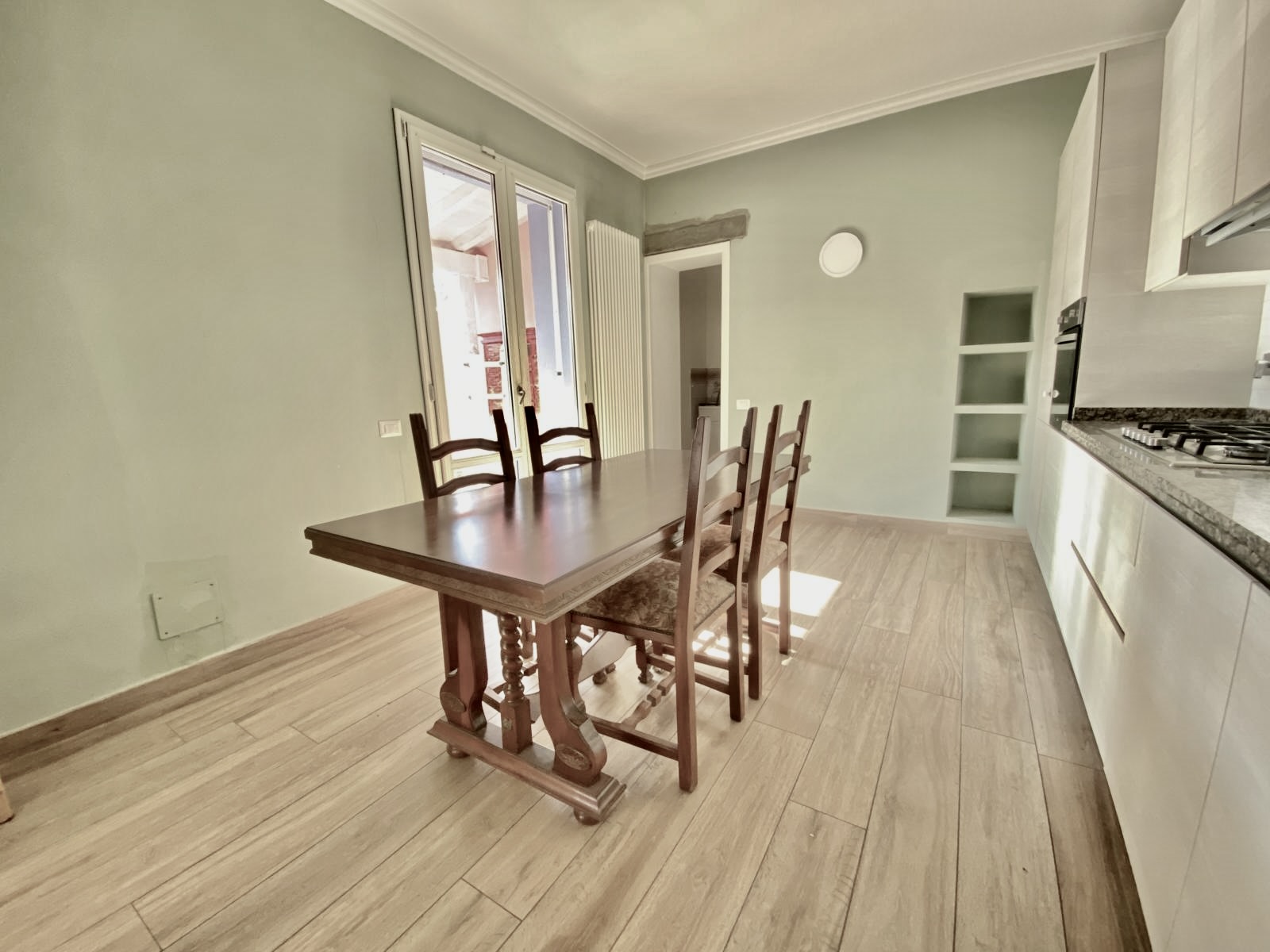 Dalla cucina e dal soggiorno si accede a una resede pavimentata di oltre 50 mq, in parte coperta da tettoia, perfetta per pranzi all’aperto, cene con amici o momenti di relax.