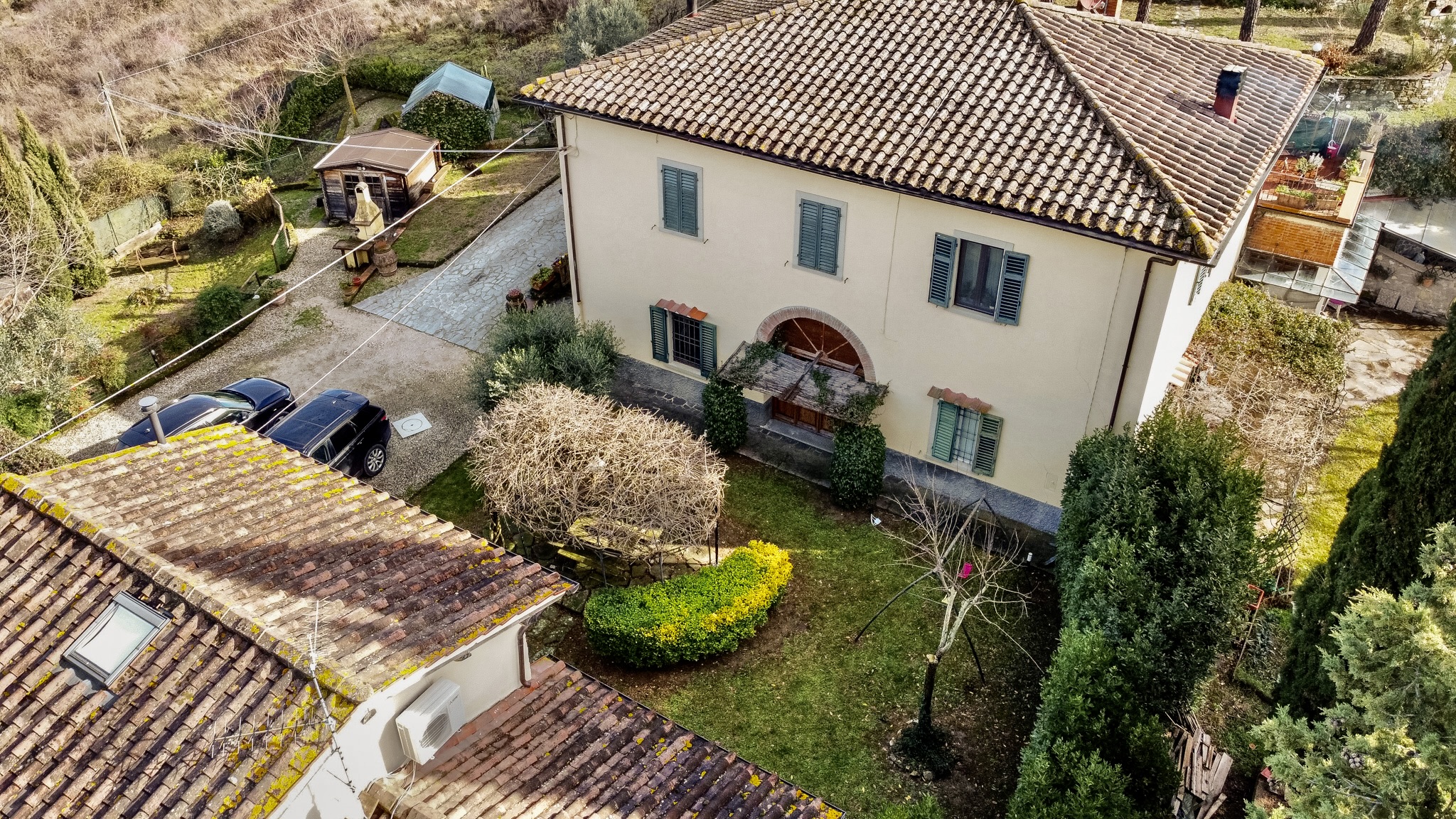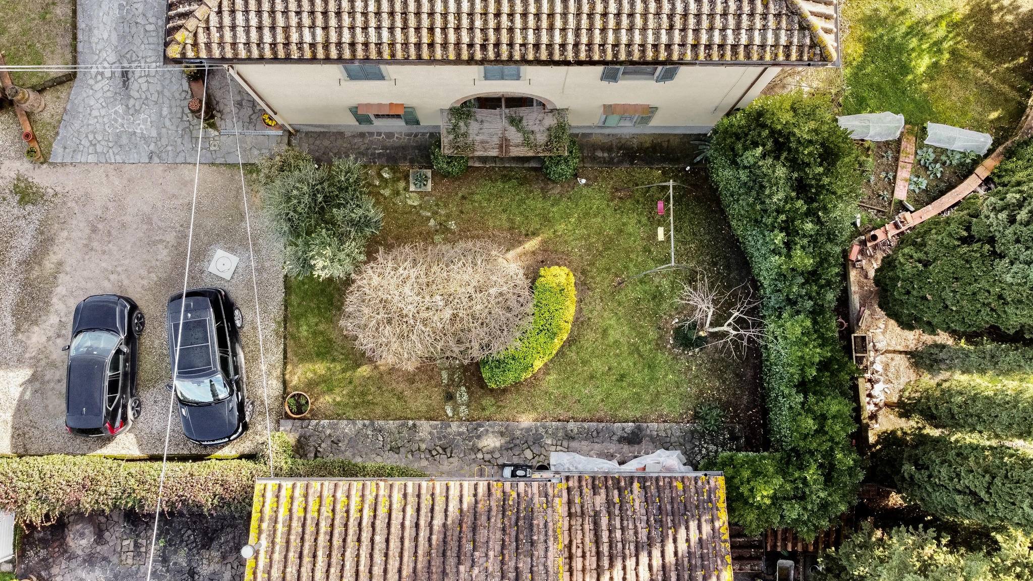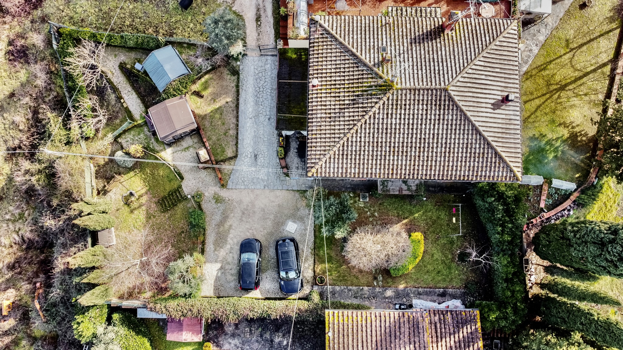 L’accesso alla proprietà avviene tramite cancello carrabile elettrico, che introduce in un contesto riservato e curato, con almeno tre posti auto interni.