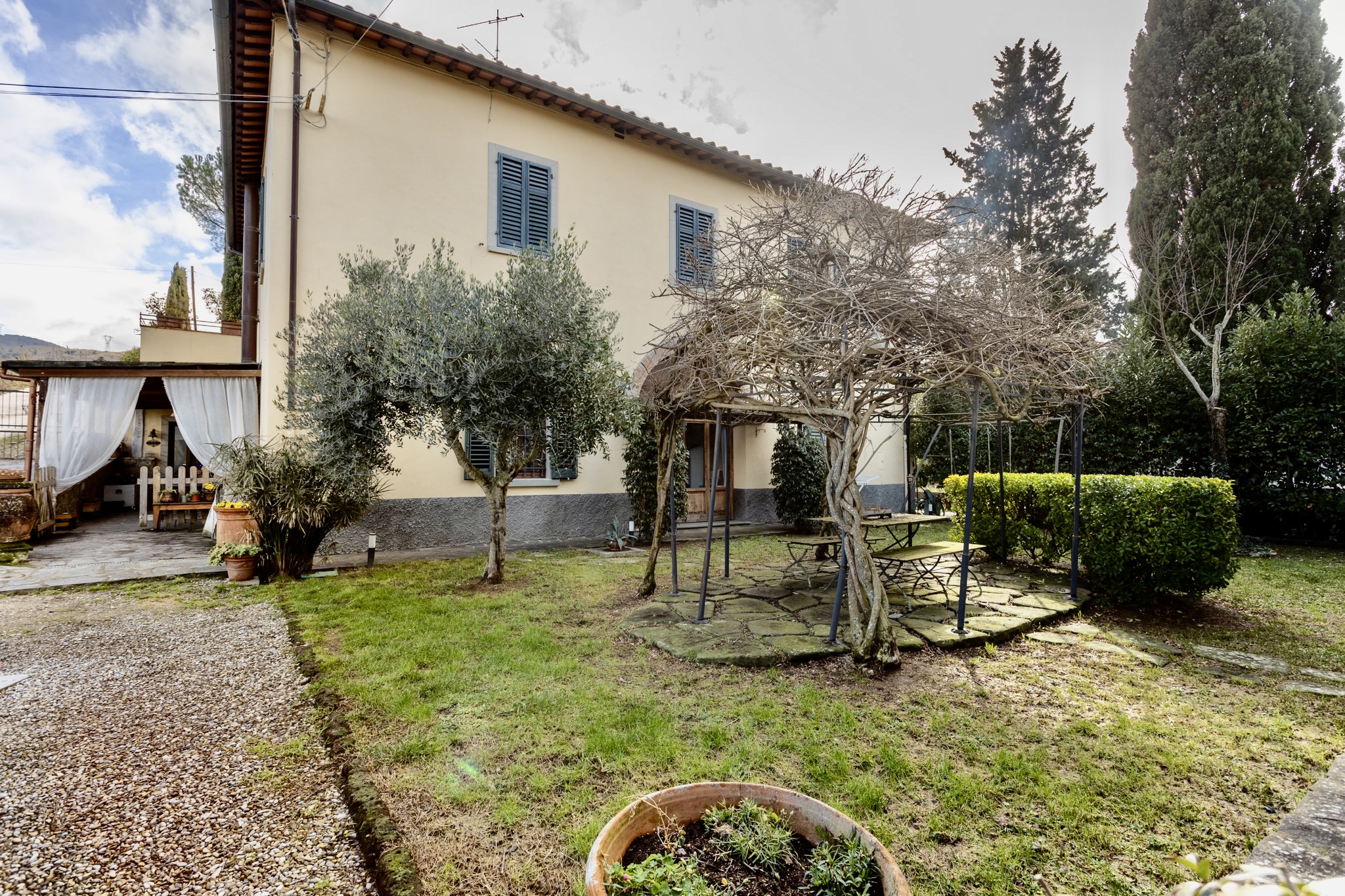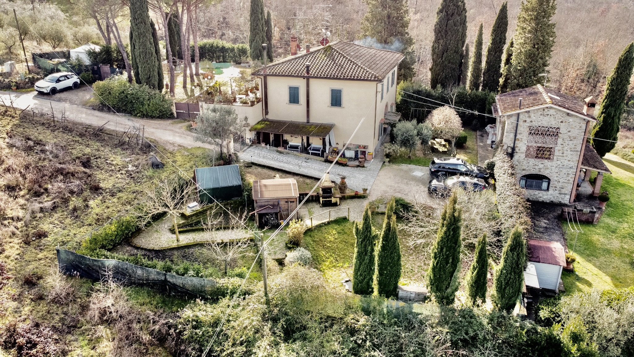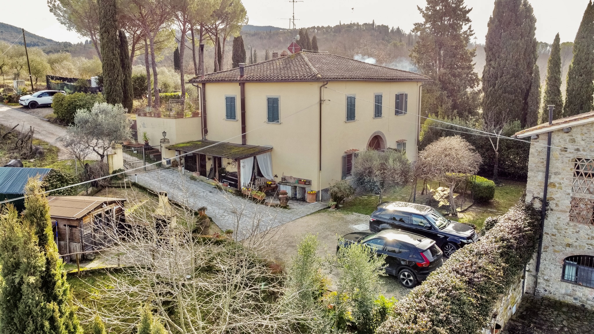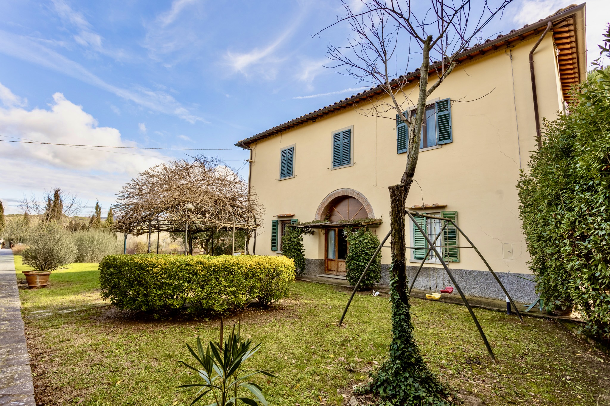 L’accesso alla proprietà avviene tramite cancello carrabile elettrico, che introduce in un contesto riservato e curato, con almeno tre posti auto interni.